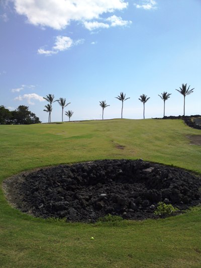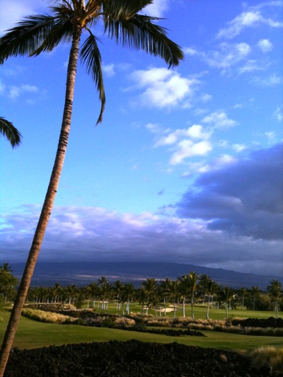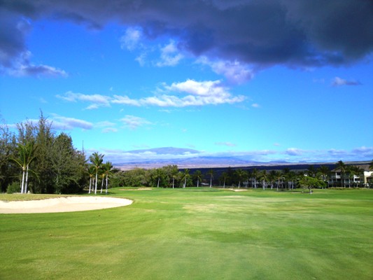 こちらは14番ホール パー4のティーグラウンドからの風景。向こうには標高4205mのマウナケアが見えています。