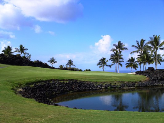 池越えの二打目以降が打ち上げになるパー5。スライスすると溶岩地帯があります。