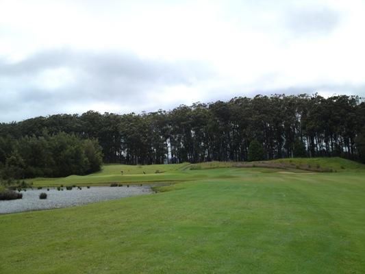 打ちおろしで途中から左に池があるパー5。グリーンは池に回り込んだところにあります。