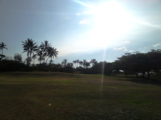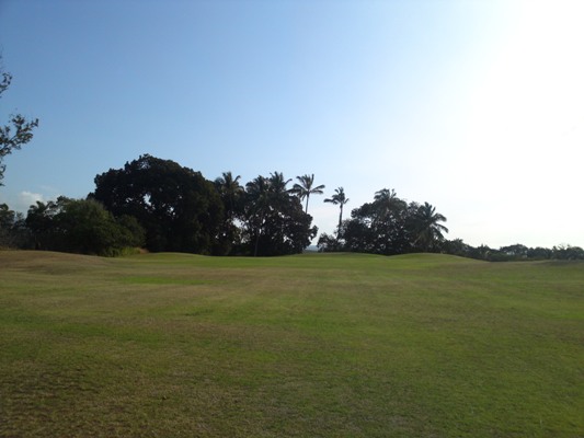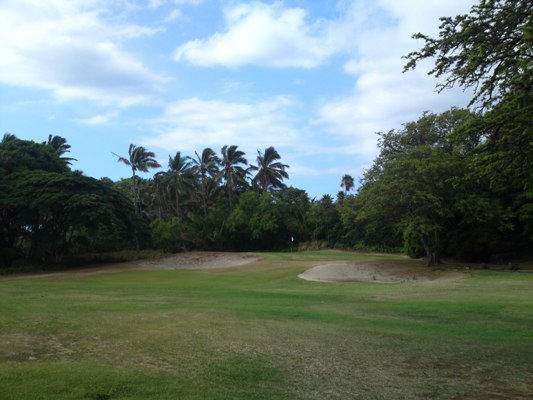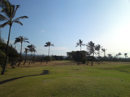 距離の短いパー4。グリーンは右にあり、正面は椰子の木がガード。左は見えませんがフェアウェイが広いので左から狙うか、正面の椰子の木越えを狙うか。