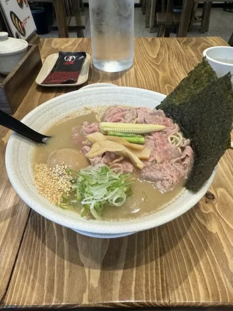富士ビーフという聞いたことない牛肉をトッピングした豚骨ラーメンが面白そうなので少し値が張るがそれにした。牛肉はレアかウェルダンが選べるのでレアで。