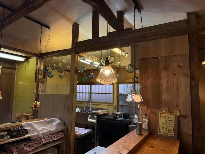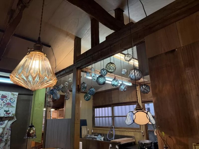 入り口も本当にここ?という通路の先に扉がある。通路のライトも高江洲さんらしいランプが。