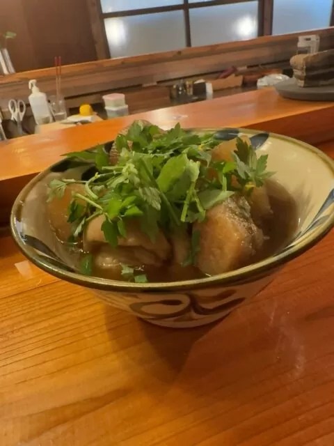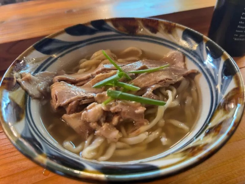 高江洲さんプロデュースなので無化調で澄んだスープで柔らかい味。スライスした三枚肉がしっとりしていて豚の旨味を味わうことができる。