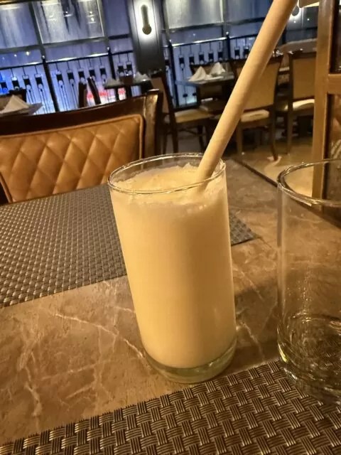 あとからじわじわくる辛さを和らげるのにラッシーがちょうどよい。口直しに酢漬けの赤玉ねぎも合う。