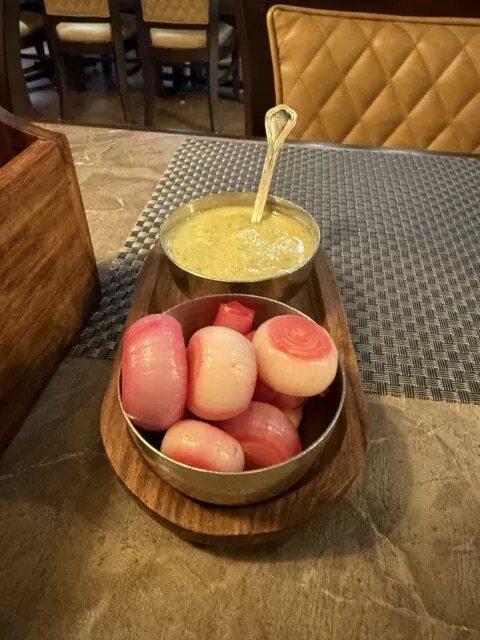 無料の付け合わせのシルケ・ワーレ・ピャーズ(酢漬けの赤玉ねぎ)ミントとコリアンダーのチャトニ