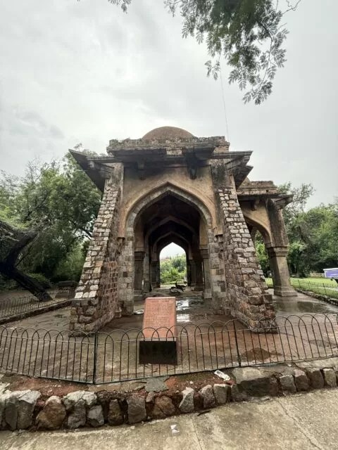 横にある遺跡は、BARAH-KHAMBA(バラ・カンバ)というかつて12本の柱があった15世紀の墓廟で中央の大きなドームの周りに4つの小ドームがあったが、現在は東側のドームが崩落していて10本の柱だけが残っていて中央のドームの下には誰のものか分からない墓があると石碑に書かれていた。