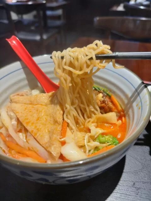 ベジメニューなので、具材は、お揚げや野菜のみ。スープは担々麺風で工夫されているけどやっぱり野菜のみの構成なので、不味くはないけど物足りなさが残るラーメンだった。