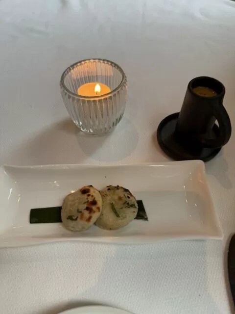 アミューズとして登場したのは芳醇な香りのブルーチーズナンとかぼちゃとココナッツのShorva(ショルバ)