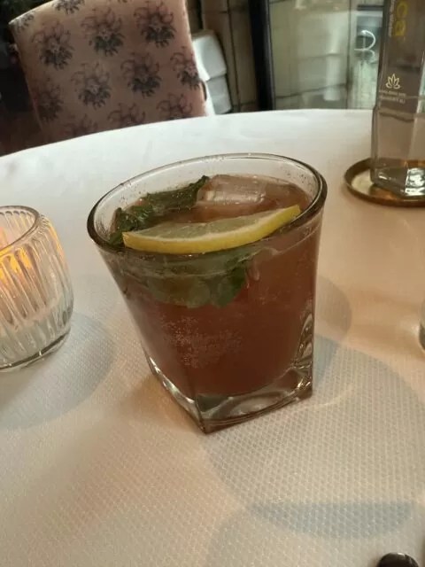 タマリンド、ライム、ミント、岩塩、ターメリック、ジンジャーエール。酸味とスパイスの輪郭がはっきりしていて、食事にも合うドリンクだった。