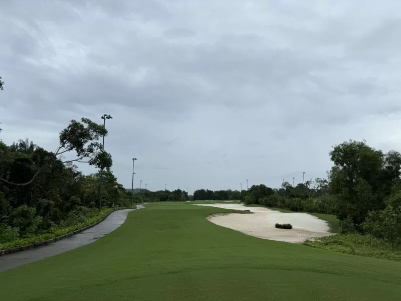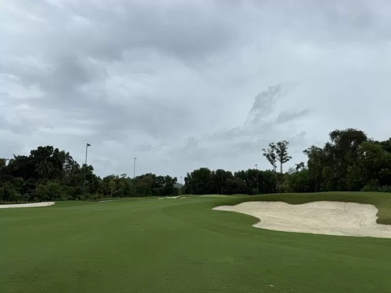 コースは島の北西部、Vung Bauビーチ沿いに位置し、前半は熱帯林の中、後半は海へと抜けていく“森から海へ”のレイアウトが特徴だ。ただし海は常に見えるわけではなく、見えるのは一部ホールに限られる。一方でVinpearlは海が見えない。景観の方向性は違うが、池や巨大なバンカーを多用した設計など、全体の雰囲気は同じIMGらしく近いものを感じる。