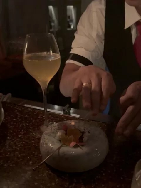 白ワインをベースに、レモンリーフの蒸留液、柚子、コンブチャ、酸味成分、炭酸を合わせたカクテルで、白ワインをベースにピーチっぽいニュアンスへ寄せた一杯なのかなと思った。