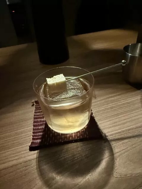 味の方向はハーバル、旨味、スモーキー。実際、青いパセリの香りの中に、海っぽさを思わせる旨味があり、そこにメスカルの味わいが重なる。さらに青唐辛子の刺激、ココナッツのやわらかさ、フェタチーズの塩気まで加わって、カクテルというより小さな料理を飲んでいるような感覚だった。
