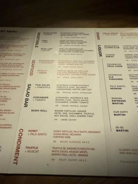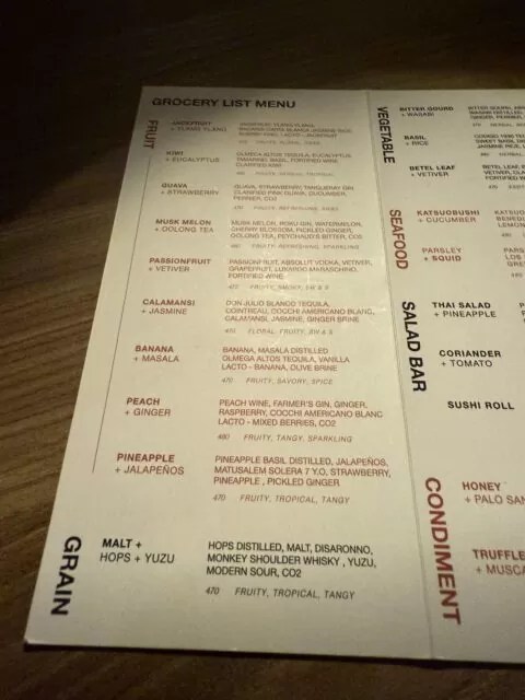 メニューも果物、野菜、シーフード、調味料、酒といった具合に分類されていて、バーのメニューというより、食料品店の棚を眺めているような構成になっていた。