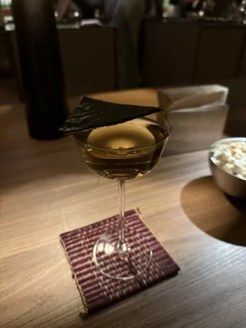 わさびの蒸留水、生姜、Ketel One、きゅうり、トリュフ、醤油、唐辛子、フィノ・シェリーを使用し、グラスの上には海苔が。