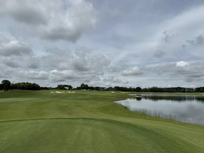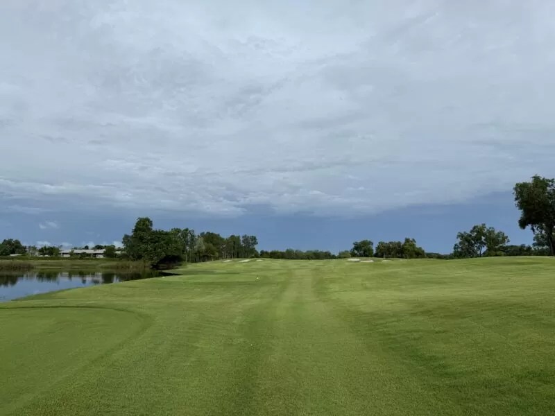 やや右ドッグレッグのパー4。ブルーティーはこの位置から遥か右後ろのアイランドティーボックスから池越えのティーショットになる。