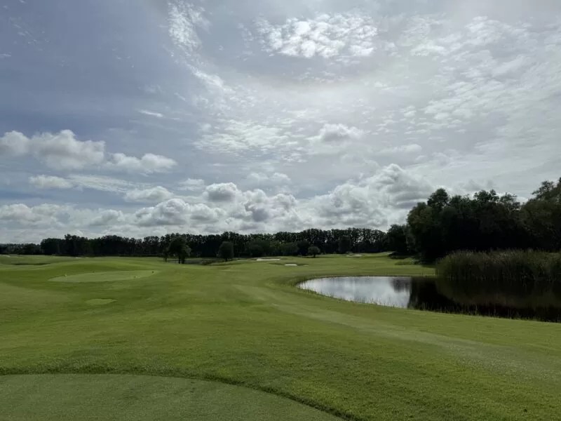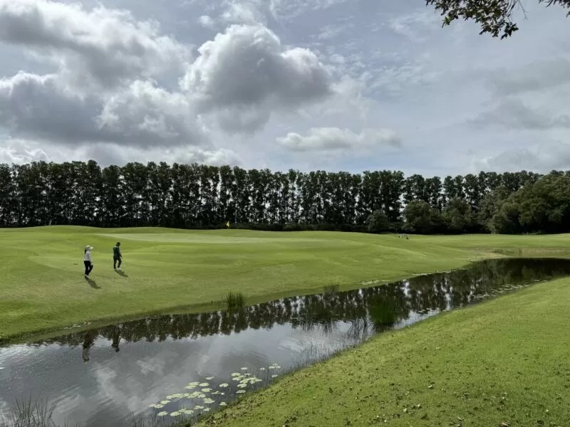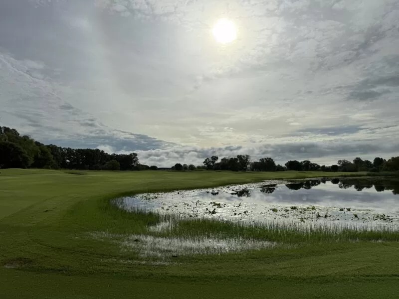 両サイドはずっと池が続く。ティーショットはフェアウェイは広いがセカンドショットから狭くなる。