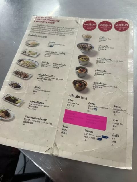 メニューを見ると、カオマンガイだけでなく、内臓やスープなども並んでいた。