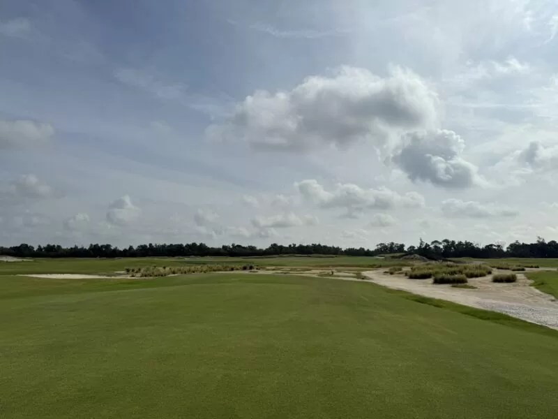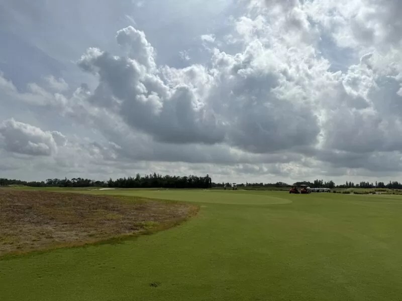 左ドッグレッグのパー4。NGLAの14番を参考に造られている。左の窪んでいるエリアは池が配置されている。オリジナルのリドーは池ではなくウェイストエリア。