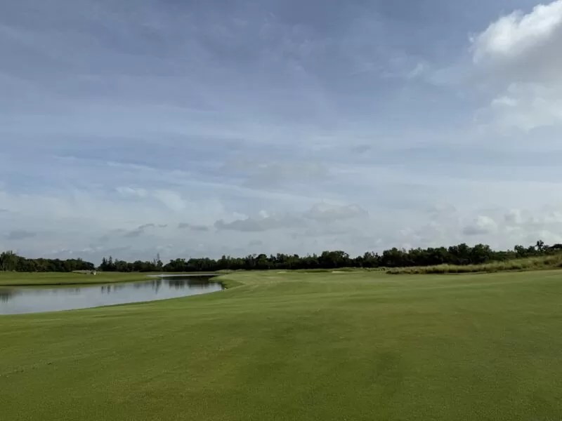 池越えで左に対角線上にフェアウェイが延びるパー4。オリジナルは逆に右にフェアウェイが延びている。