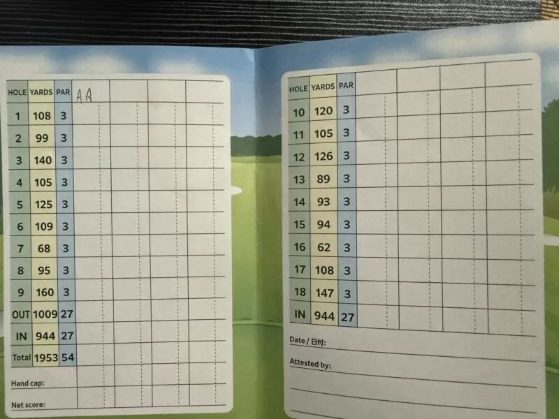 支払いを終えてスコアカードを受け取る。9ホールのレイアウトはこのような形で、左下の池があるホールが1番ホール。そこから反時計回りにルーティングされている。